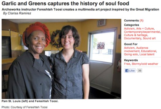 Fereshteh Toosi wants people to talk about soul food. The 35-year-old artist is collecting stories about the cuisine that African-Americans brought from the South during the Great Migration, when they planted okra, garlic, greens, red beans and yams in their Chicago gardens. She’s starting GARLIC & GREENS, a soul-food oral history archive, which will be accessible online, as a fellow at Archeworks, the socially engaged design school in River North.